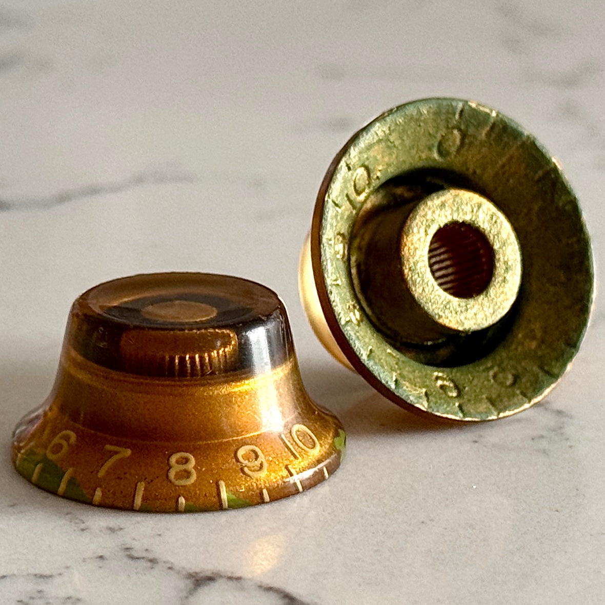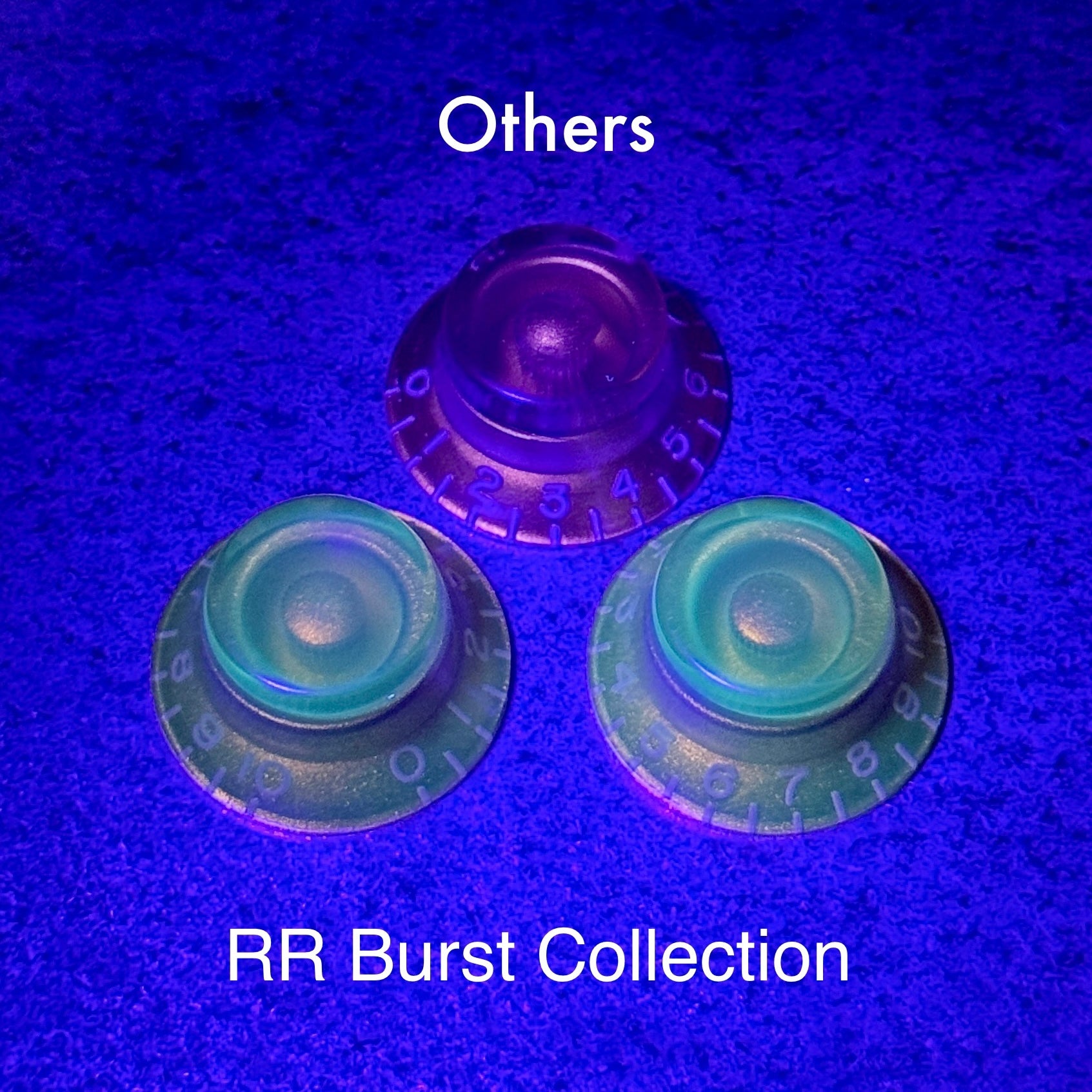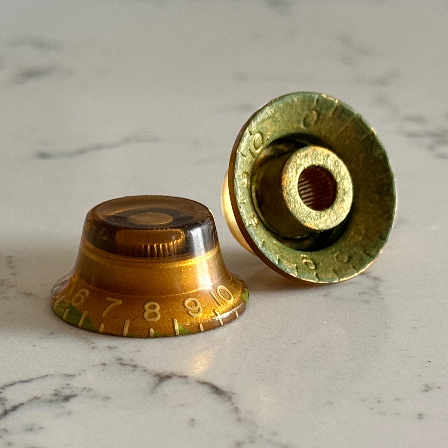 The iconic Burst Bonnet Knobs (Bell Knobs) remade by so many, but nothing compares to these proper CAB (Cellulose Acetate Butyrate) reproductions, which will even glow under black light like the originals. 3D Scanned and recreated in every detail, not only do they "feel right" with the CAB Material - The biggest visual difference is the shape: Original bonnet knobs were shaped almost similarly to Strat knobs with a steep side profile, they also feature a noticeable dimpled top, whereas modern remakes like ones found on USA Standards and Custom Shops pre 2020 are shaped with a much more simplistic slope and flat tops (See pics). Burst Collection - The best reproductions available.